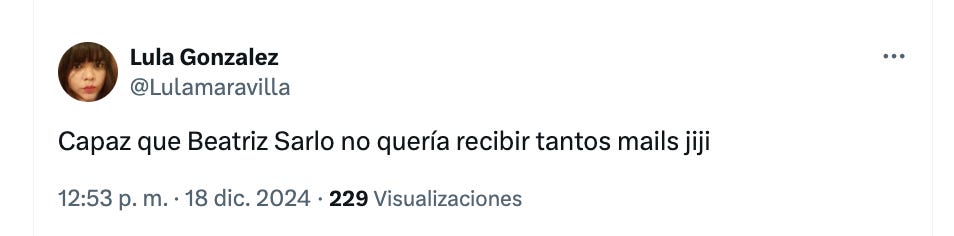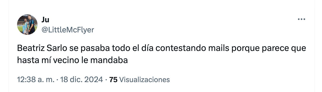 Esta semana falleció la escritora Beatriz Sarlo y las repercusiones y homenajes fueron enormes. A la tradicional publicación de fotos con la persona fallecida en esta oportunidad se sumaron decenas de intercambios epistolares con la pensadora argentina por varias razones: era una figura muy interesante y requerida en notas, contestaba los correos y lo hacía de una manera particular.