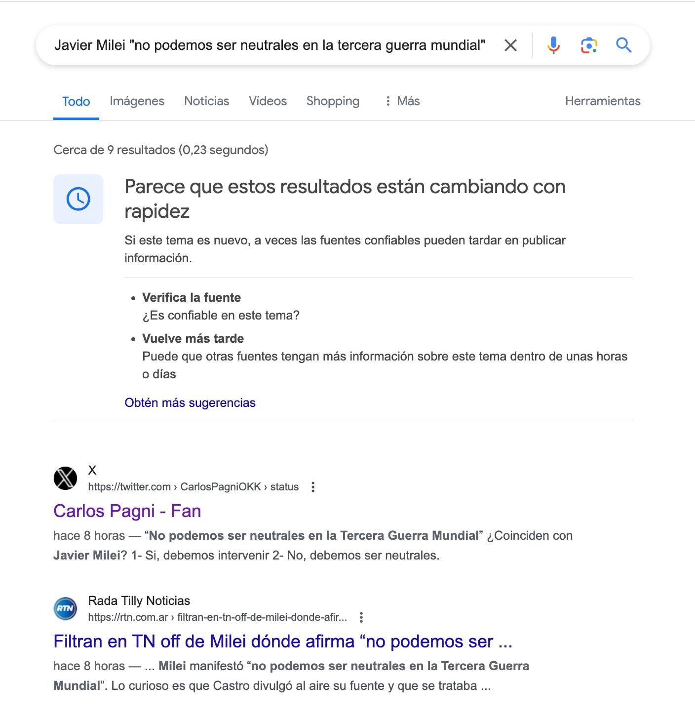 Sigo buscando. Pongo “Milei, Guerra Mundial”. Encuentro este video cortado en el que, supuestamente, Javier Milei dijo “no podemos ser neutrales en la tercera guerra mundial” (pregunto yo ¿qué guerra?). Al textual de dicho tuit, Milei le dio like.