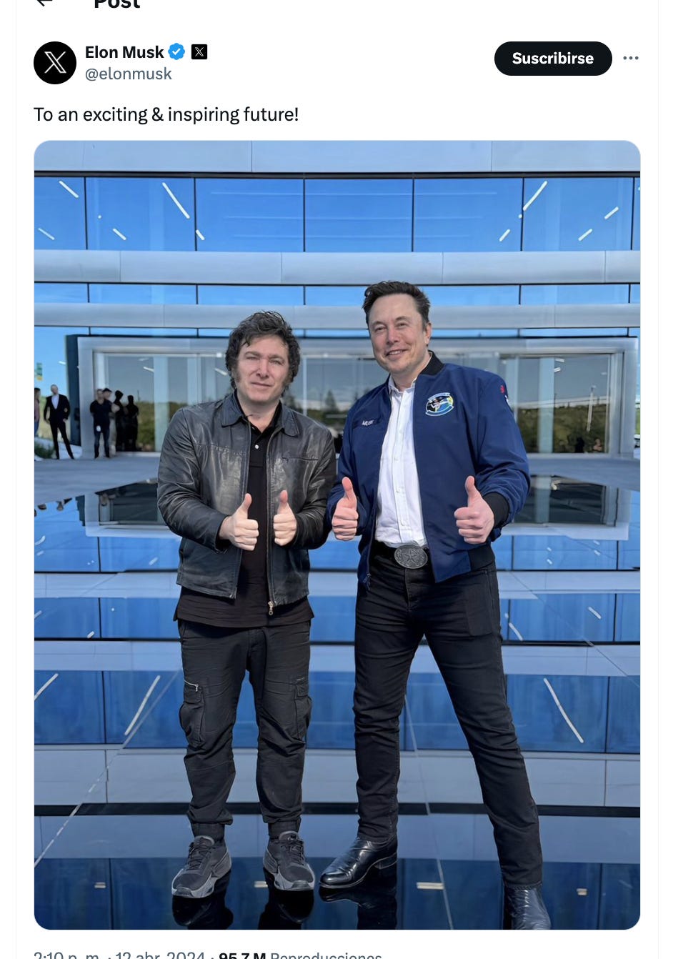 Me quedó afuera este temón pero ya habrá oportunidad. Posteo en X de Elon Musk tras la visita de Javier Milei a las oficinas de Tesla en Texas, EEUU.