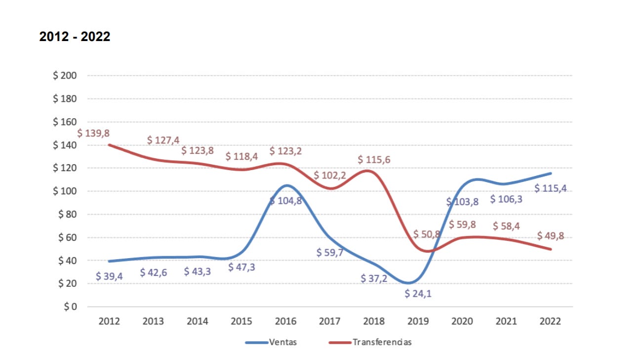 Este gráfico ilustra la disminución de ingresos por transferencias del tesoro y un salto exponencial de ingresos por ventas. Se aprecia el cambio de la composición de ingresos y origen.