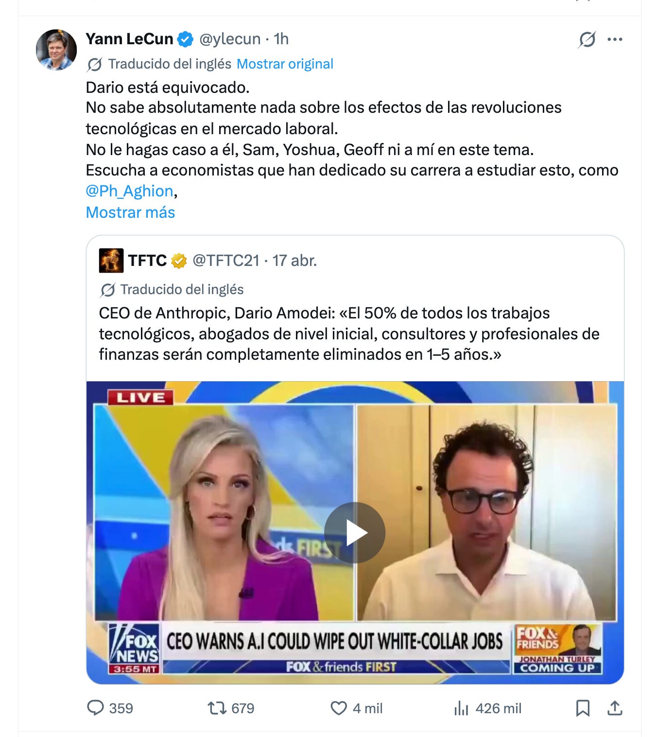 Unas horas después, Yann LeCun, uno de los pioneros de la IA, tuiteó que Dario estaba equivocado. Que no sabe nada sobre los efectos de las revoluciones tecnológicas y que “no le hagas caso a él, Sam, Yoshua, Geoff ni a mí en este tema.