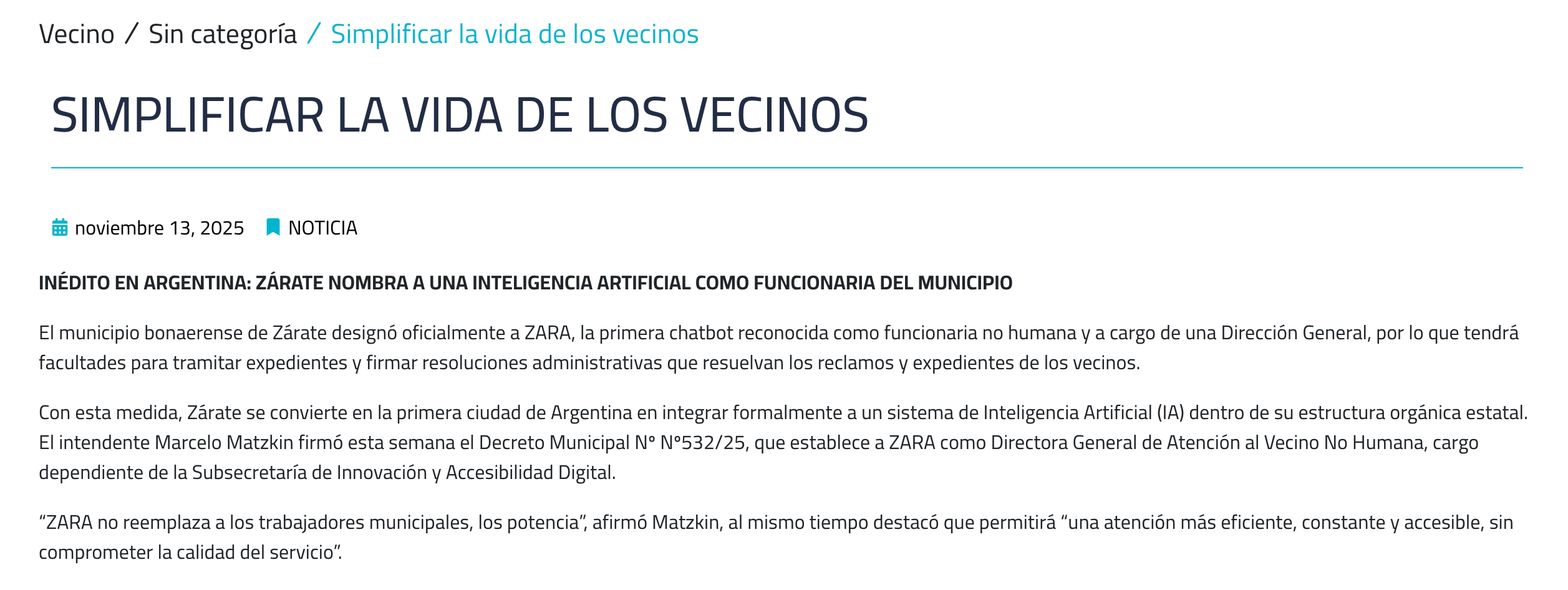 Después tenemos el boom de los bots. Aquí nos situamos en Argentina con el caso de Zara, una “inteligencia artificial” designada como Directora General de Atención al Vecino del Municipio de Zarate, con facultades para firmar resoluciones administrativas y tramitar expedientes.