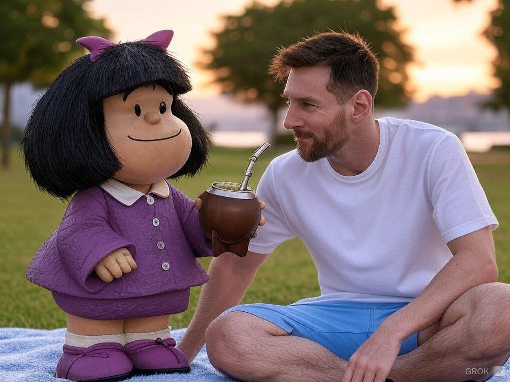 Volviendo a la pregunta inicial, apenas lanzado Grik, me pareció divertido pedirle a Grok una foto de Milei desde abajo con papada, algo que el nunca haría. Después me arrepentí y me puse a pensar, más allá del chiche nuevo, qué implicancias tenía esta posibilidad ilimitada de juntar amigos y enemigos en una foto hecha con IA. No sabemos adonde llegará pero sigo el tema de cerca para próximas entregas. Por eso, cambié de rumbo, y pedí algo más inocente: Messi con Mafalda tomando mate. Después de muchos intentos, logró algo digno.
