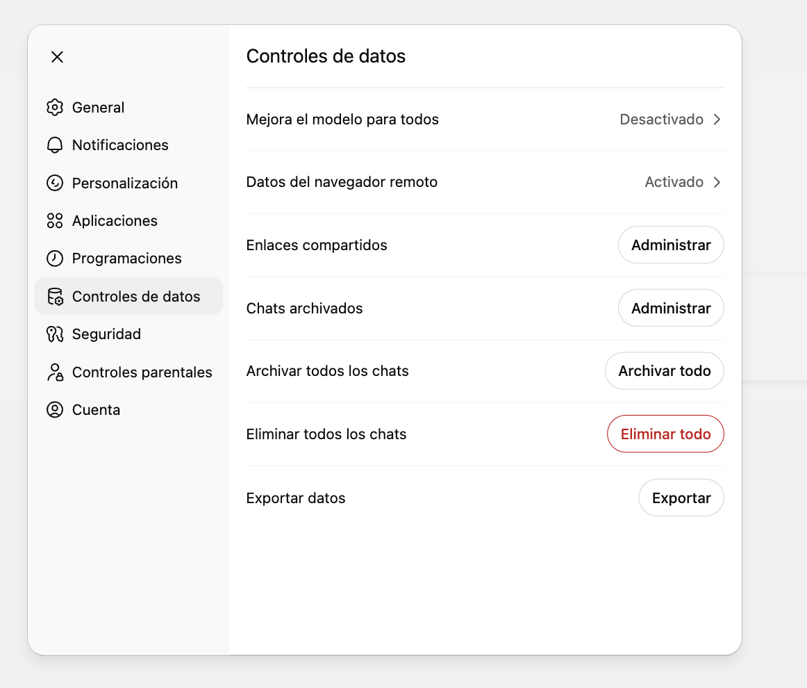 Si desactivamos la memoria o eliminamos los chats antiguos, la experiencia no será tan personalizado. El lado bueno: no confundirá nuestros proyectos cuando necesitamos algo, porque mezcla todo. Lo mismo si borramos el historial. Lo que sí podemos hacer -y lo recomiendo- es en Configuración → Controles de datos, desactivar la opción "Mejorar el modelo" para que no lo entrene con nuestros datos.