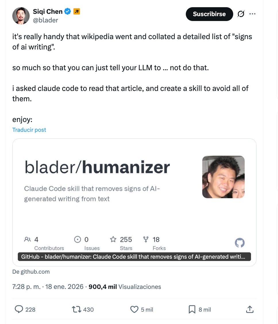 Este complemento para Claude llamado Humanizer le da a Claude la lista de 24 patrones de lenguaje y formato que los editores de Wikipedia incluyeron en esa guía.