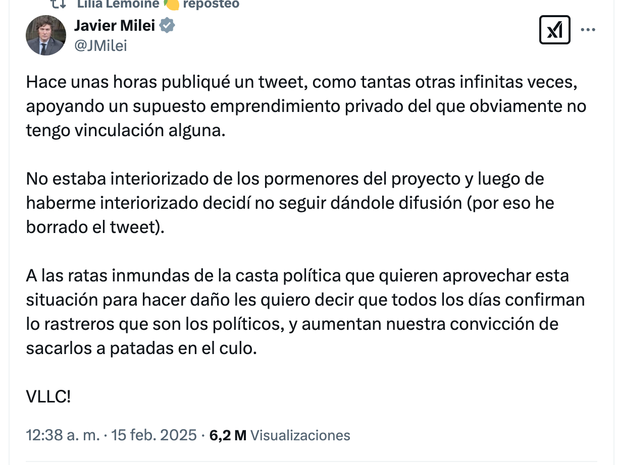 Cuando empezó, La moneda US$0,000001. Cuando Milei la publicitó, llegó a US$5,20. Al cierre de este newsletter, $Libra se cotizaba a 0.4146 centavos de dólar. Un un detalle de hoy domingo 16 de Febrero, si hacen click en la información de la moneda lleva al tuit borrado de Milei.
