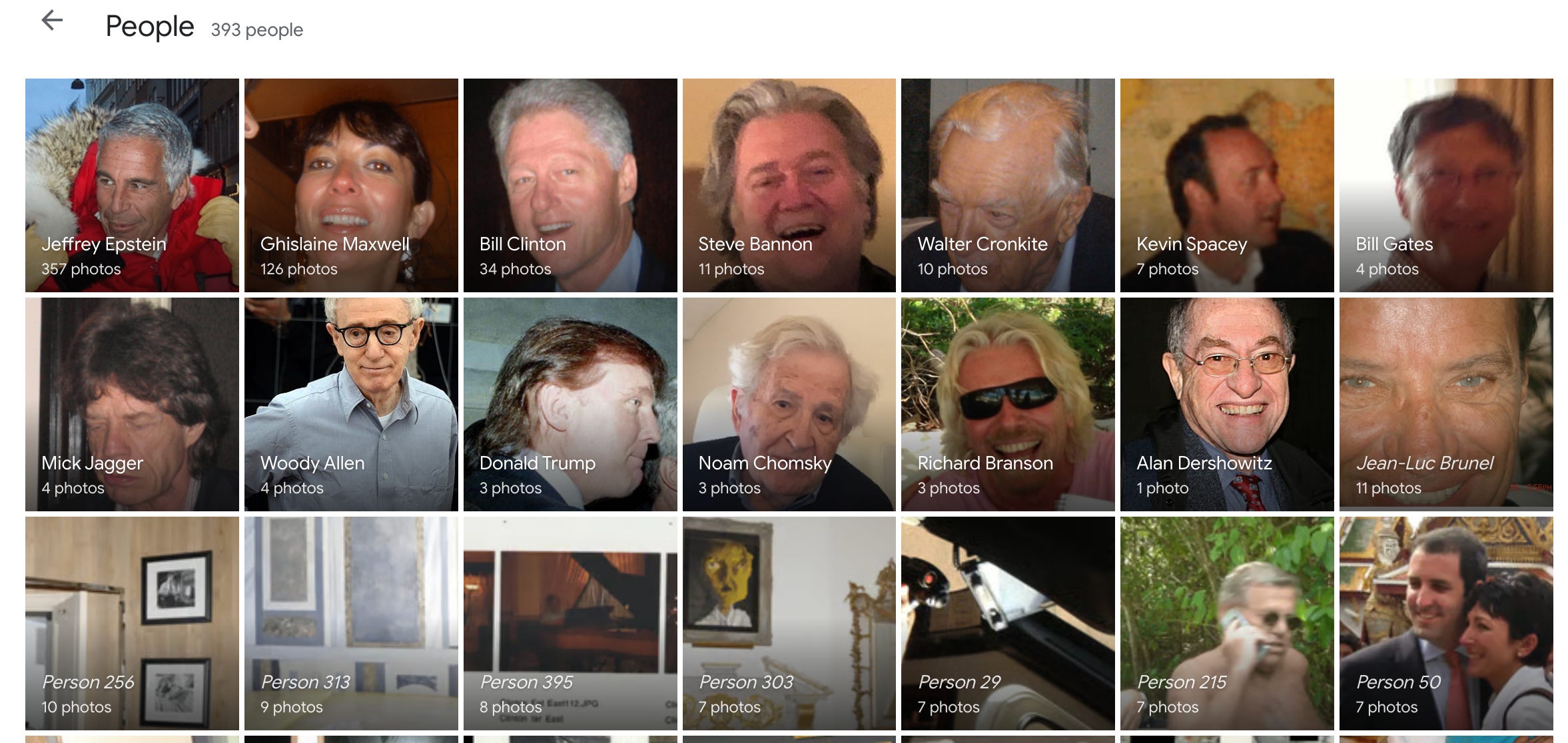 También hay fotos marcadas con un favorito, que son las más polémicas. El sitio usa herramientas de reconocimiento facial y OCR para agrupar las caras encontradas en las más de 180,000 imágenes y documentos que componen la filtración.