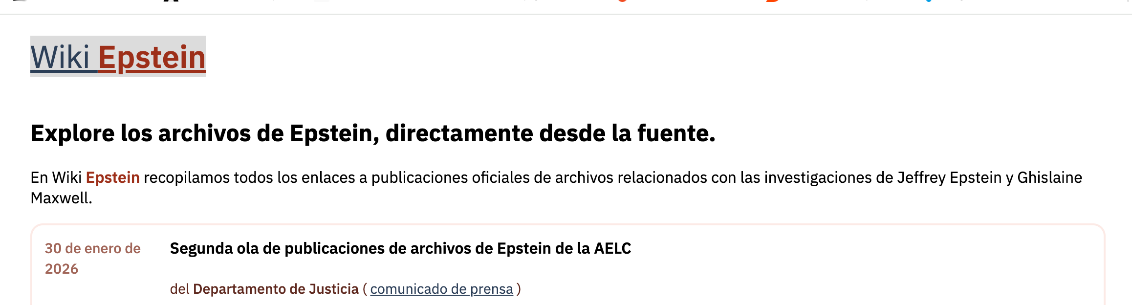 WikiEpstein es un sitio web colaborativo y de consulta pública alojado en wikiepstein.com y lanzado en enero de 2026. Es como una wikipedia dedicada a organizar y analizar los archivos desclasificados de Jeffrey Epstein, incluyendo documentos judiciales, correos y registros liberados por el Departamento de Justicia de EE.UU. desde fines de 2025. Permite búsquedas interactivas de nombres, conexiones y menciones frecuentes, como una Wikipedia temática, con énfasis en transparencia y verificación de fuentes primarias.