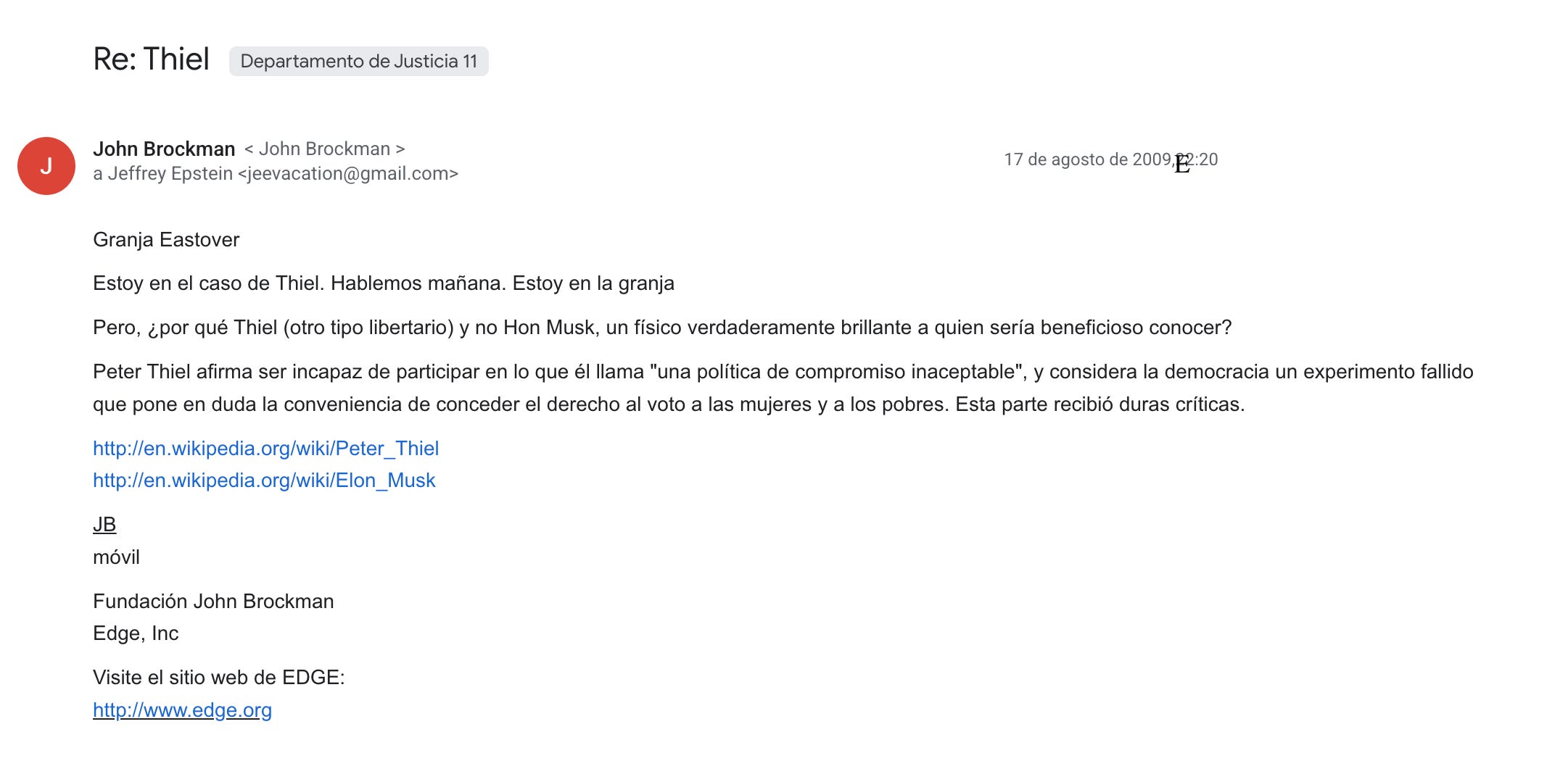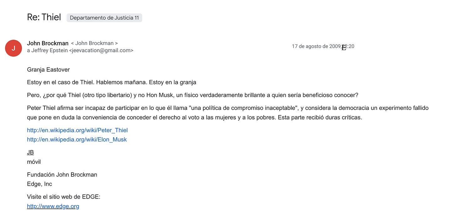 Peter Thiel, el multimillonario cofundador de PayPal y Palantir, está mencionado 2200 veces en este último lote de archivos publicados, aún después de que se declarara culpable de prostitución de menores en 2008. En 2015 y 2016, Epstein invirtió 40 millones de dólares en dos fondos gestionados por Valar Ventures, una de las firmas de inversión de Thiel.