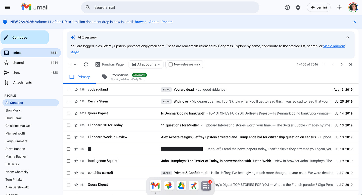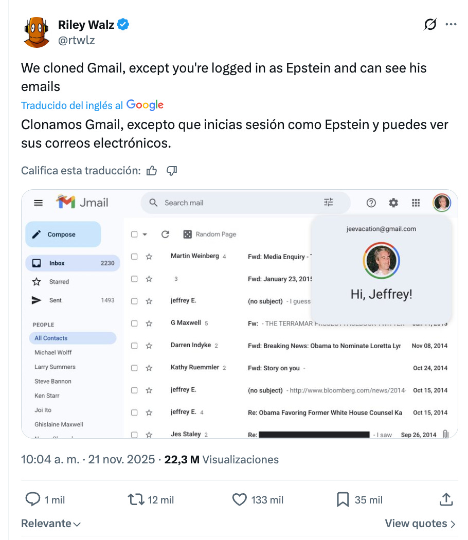 Cuando vi este sitio no lo podía creer: todos los correos enviados y recibidos por Jeffrey Epstein como si fuera una casilla de correo. El Jmail con J simula es un espejo de sus dispositivos personales y cuentas de Gmail del fallecido pedófilo, con conversaciones con muchos de sus secuaces, muchos que lógicamente conocemos porque son políticos, multimillonarios, actores, etc.
