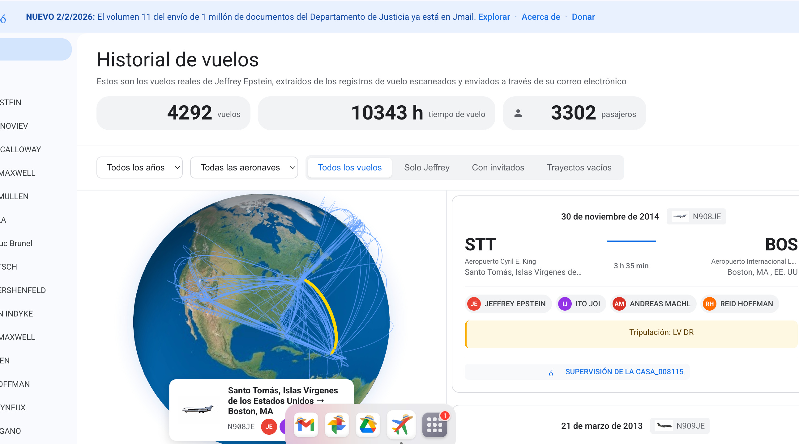 Aquí se puede buscar con quien viajó y cuándo viajo. No hay vuelos a Latinoamérica desde su Jet Privado pero como llamativo si encontré 7 vuelos con el CEO de LinkedIN, Reid Hoffman, el cuál tiene 2.658 archivos de menciones. El ya explicó que sus reuniones eran para recaudar fondos para el MIT Lab y también dijo estar arrepentido, como casi todos, por haber interactuado con Epstein en una publicación de Axios en 2019.