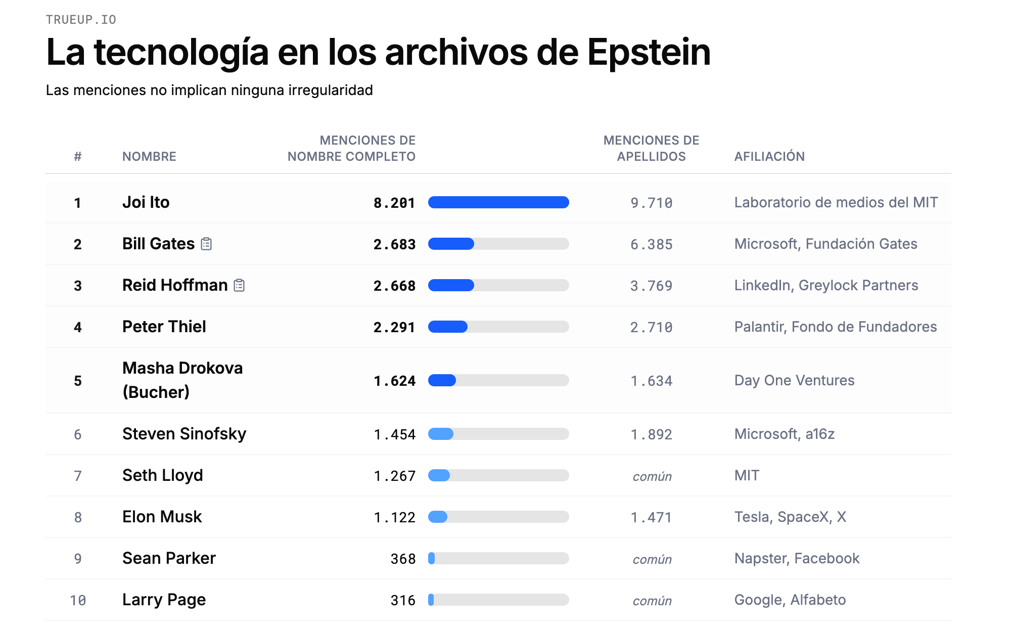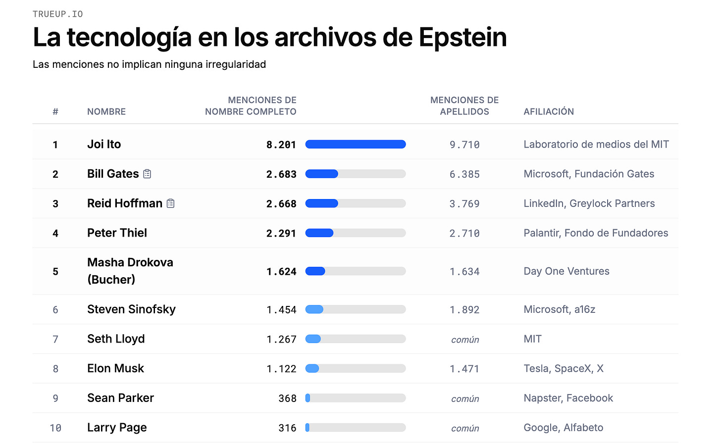 También están los dos fundadores de Google, Larry Page (314 archivos) y Sergey Brin (294 archivos). El dueño de Meta, Mark Zuckerberg, está en 282 archivos, el de Amazon, Jeff Bezos, en 196 archivos, y el ex CEO de Google, Eric Schmidt, en 193 archivos. Elon Musk, dueño de SpaceX, Tesla y X, en 138 conversaciones 👀.