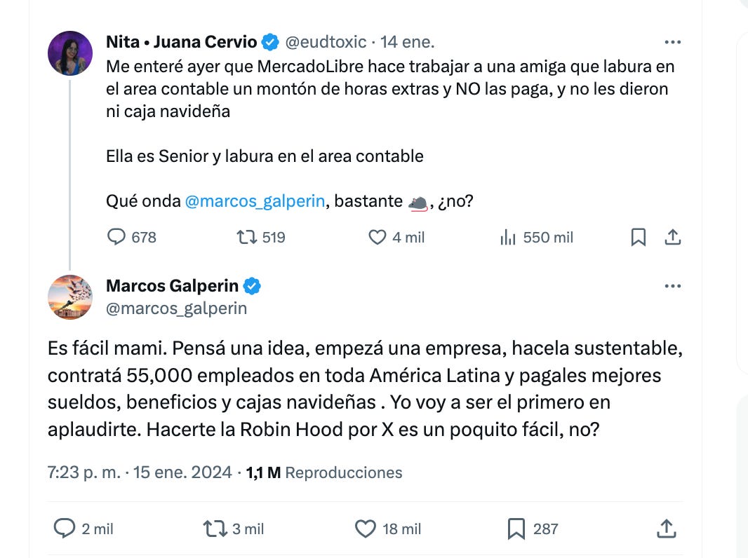 Encuentro algo en común entre Elon Musk, Galperín e incluso Jeff Bezos -aunque tenga un perfil más bajo-, la desigualdad tan grande las fortunas que tienen respecto del resto de la humanidad conjuga esa poca rendición de cuentas que se les exige con la exacerbación el lugar de prestigio donde aún se pone a los empresarios tecnológicos. Todavía parece que ellos hubieran hecho todo por sí mismos y no se hubieran beneficiado de las innovaciones en investigación (educativa, científica, desarrollo) en las cuales el Estado invirtió para que se fueran ricos.