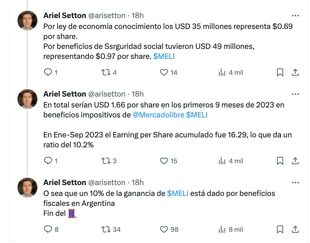 ¿Qué tienen en común Marcos Galperín, Elon Musk y Javier Milei? Su filosofía liberal y el postulado de que el Estado no se meta. Aunque si el Estado tiene una política que te beneficia, como la Ley de Software en un primer momento y la Ley del Conocimiento después, no está tan mal. MercadoLibre se beneficia desde 2007 con excepciones impositivas. Detalla el economista Ariel Setton que, por esta ley, Mercado Libre tuvo beneficios por 84 millones de dólares en los primeros meses del 2023, lo que representa un 10% de las ganancias.
