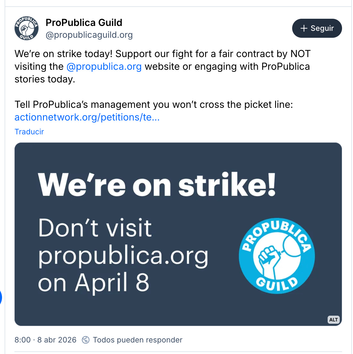 Las callecitas del barrio de Hudson Square de la ciudad de Nueva York, las de Chicago y las de Washington D.C. presenciaron la primera huelga de periodistas convocada por el sindicato ProPublica Guild. La huelga de 24 horas fue analógica: más de 150 periodistas salieron a las calles con consignas en pancartas que rezaban “Trabajadores de ProPublica: Merecen un salario justo” y “Pensamientos, no bots”.